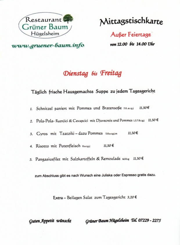 Unsere Mittagstischkarte bietet Ihnen eine wöchentlich abwechselnde Auswahl an fünf Gerichten. Zudem gibt es jeden Tag eine frisch zubereitete Suppe zu ihrem Essen dazu.